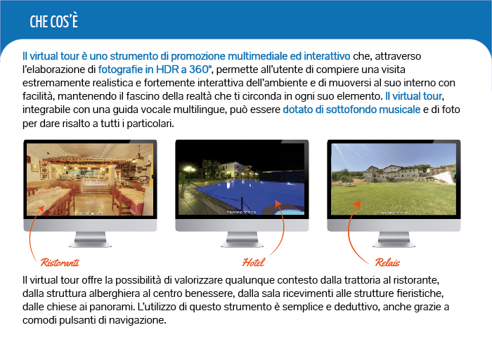 Un sito web aggiornato e ricco di contenuti è il biglietto da visita ideale per presentare e promuovere la vostra azienda. Una grafica accattivante e una struttura ottimizzata per i motori di ricerca rappresentano il punto di partenza ideale per conquistare la rete. L’interesse del potenziale cliente sarà sicuramente amplificato dalla presenza dei virtual tour, la vera marcia in più del vostro sito web.