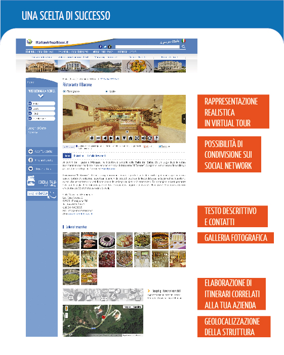 Stiamo digitalizzando e valorizzando già , da oltre due anni, il territorio italiano. Abbiamo dato visibilità a migliaia di siti del patrimonio pubblico e privato. Abbiamo utilizzato i migliori strumenti e le tecnologie più avanzate di rappresentazione fotografica per generare l’interesse degli utenti con immagini immersive ed emozionali.